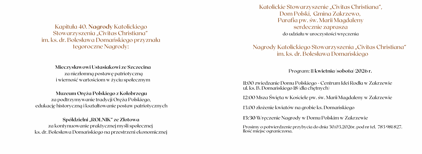 Katolickie Stowarzyszenie „Civitas Christiana”, Dom Polski, Gmina Zakrzewo, Parafia pw. św. Marii Magdaleny serdecznie zaprasza do udziału w uroczystości wręczenia Nagrody Katolickiego Stowarzyszenia „Civitas Christiana” im. ks. dr. Bolesława Domańskiego, która odbędzie się 11 kwietnia (sobota) 2026 r.