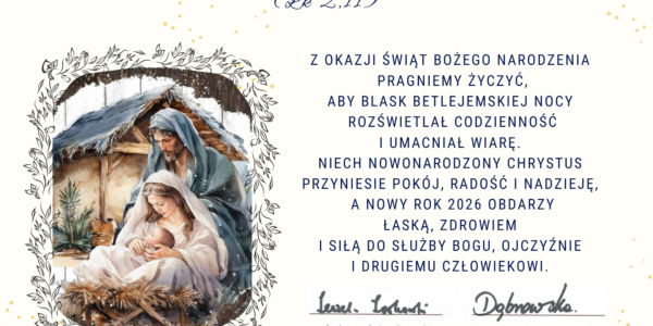 Udostępnij…FacebookTwitterWhatsappZ okazji zbliżających się Świąt Narodzenia Pańskiego składamy życzenia spokojnych, zdrowych, błogosławionych Świąt Bożego Narodzenia. To w tę wyjątkową noc Bóg przychodzi do człowieka w ciszy i prostocie Betlejem. Niech światło narodzonego Chrystusa rozjaśnia drogi, umacnia wiarę i napełnia serca…