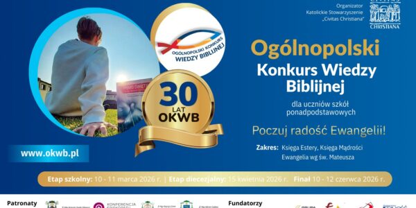 Udostępnij…FacebookTwitterWhatsappPozostały już tylko dwa tygodnie do końca zapisów do Ogólnopolskiego Konkursu Wiedzy Biblijnej. Szkołę, która chce wziąć udział w konkursie, można zgłosić przez formularz, znajdujący się na stronie www.okwb.pl. Termin zapisów upływa 2 lutego 2026 r. Zakres merytoryczny tegorocznej 30….