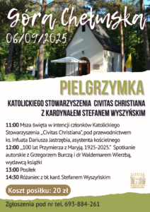 Serdecznie zapraszamy do udziału w pielgrzymce Katolickiego Stowarzyszenia ,,Civitas Christiana” na Górę Chełmską ze Stefanem Wyszyńskim, która odbędzie się 6 września 2025 r.